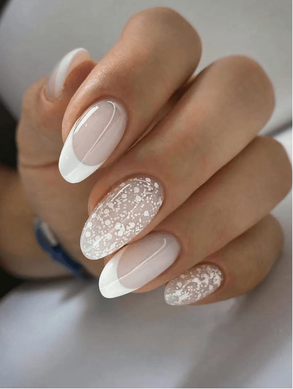 • ناخن‌های فرانچ (French Manicure): این یکی از طرح‌های کلاسیک و محبوب برای عروسان است. در این طرح، ناخن‌ها با پایه‌ای شفاف و لطیف پوشیده شده و سر بخش‌های آنها با رنگ سفید تمیز و نازک تزئین می‌شود. این طرح ظاهری طبیعی و شیک دارد و با هر سبک لباس عروسی هماهنگی می‌کند.